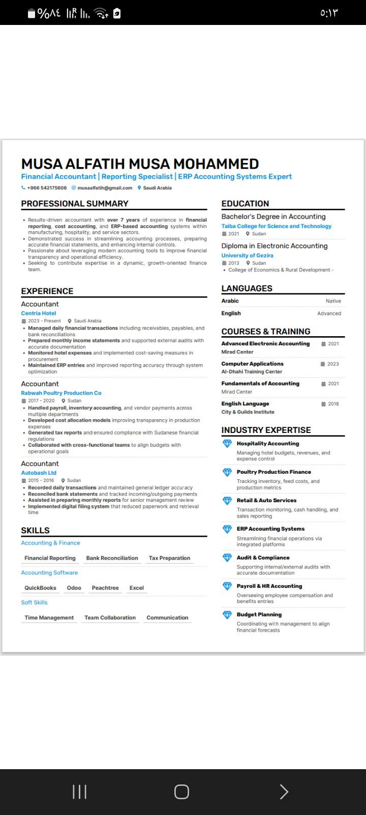 ابحث عن عمل محاسب / موظف استقبال / كاشير / أمين مستودع / لدية خبرة مع العلم الإقامة سارية حاصل علي بكالوريوس محاسبة ودبلوم محاسبة الكترونية السودان الخرطوم. رقم