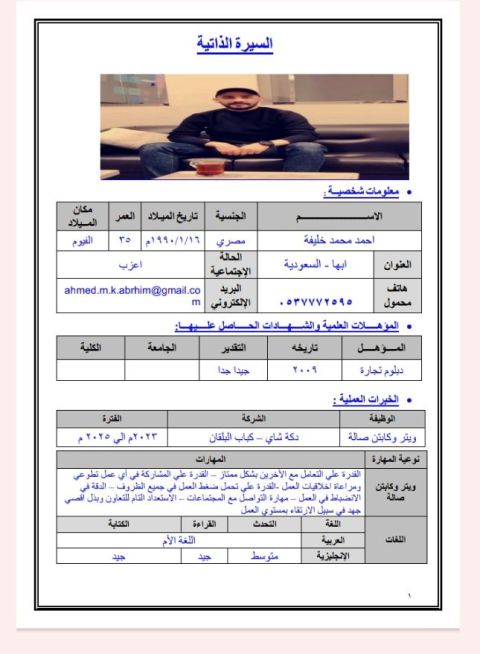 يمني الجنسية العمر 22 سنة خبرة في المبيعات واستقبال الزبون أقامه سارية اشتغلت ب العديد من المحلات لدي خبرة في سوبر ماركت الفنادق. كافيهات. المحلات البيع والشراء لدي رخصة ساق سيارة حسن المظهر والسلوك القدرة على التعامل معا العميل أو الزبون ورفع سقف المبيعات للتواصل