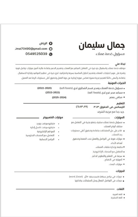 موظف خدمة عملاء واستقبال ذو خبرة في التعامل المباشر مع العملاء وتقديم الدعم بكفاءة عالية، أتميز بمهارات تواصل قوية وقدرة على فهم احتياجات العملاء وتقديم الحلول المناسبة بسرعة واحترافية. لدي خبرة في تنظيم المواعيد وإدارة الاستقبال بكفاءة، وأسعى دائما لتقديم تجربة مميزة تعكس صورة ايجابية عن جهة العمل وتحقيق أعلى مستويات رضا العملاء