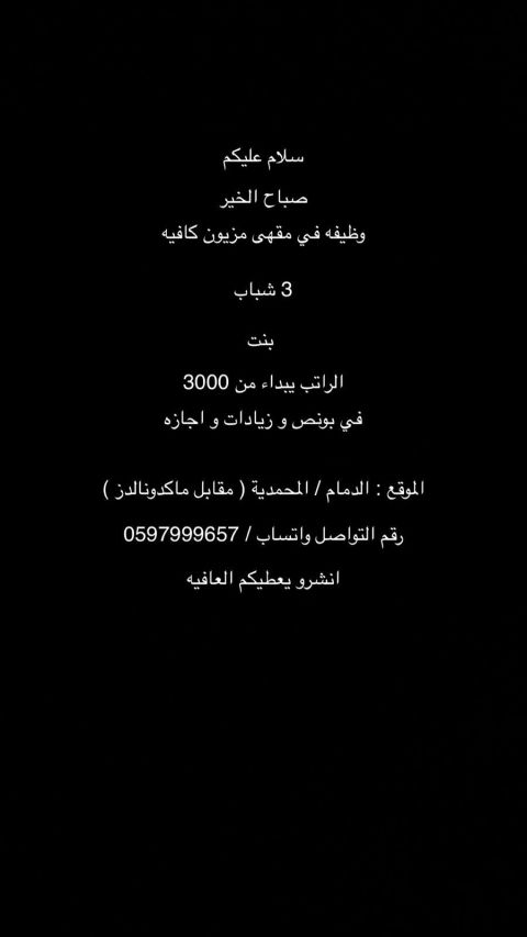 أحتاج بنات للعمل في مقهى وكافية يشترط الخبرة وحسن المظهر الجبيل