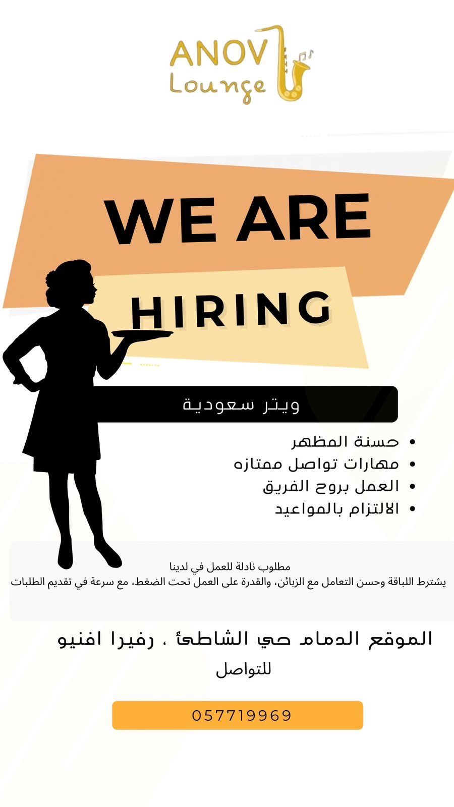 ANOV Lounge WE ARE HIRING وايتر سعودية المتطلبات حسنة المظهر - مهارات تواصل ممتازة - العمل بروح الفريق - الالتزام بالمواعيد مطلوب نادلة للعمل لدينا يشترط اللباقة وحسن التعامل مع الزبائن، والقدرة على العمل تحت الضغط، مع سرعة في تقديم الطلبات. الموقع الدمام - حي الشاطئ - ريفييرا أفينيو للتواصل 057719969