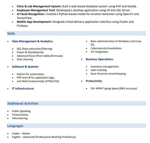 محلل بيانات تقني خريج حاسبات ومعلومات Data Analyst Computer Science Graduate متخصص في تحويل البيانات الى رؤى استراتيجية وقرارات ذكية. خبير في أدوات التحليل المتقدمة Excel (Advanced) SQL, Power BI, Python. امتلك مهارة عالية في بناء لوحات البيانات (Dashboards) والتحليل الإحصائي الدقيق لتحسين الأداء المؤسسي