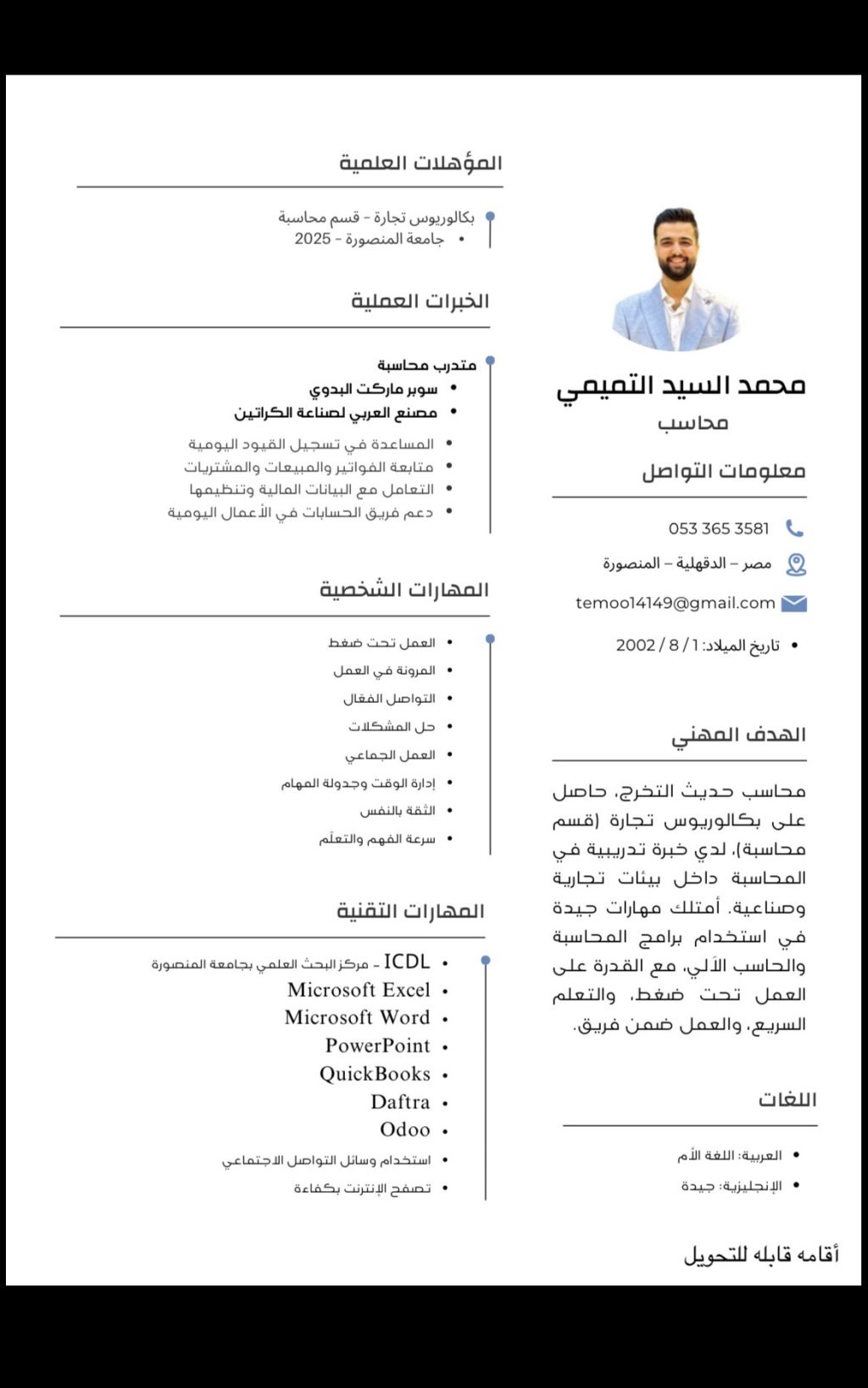 أنا محاسب خريج جامعة المنصورة أجيد التعامل مع اجهزة الحاسوب وأجيد التعامل مع برامج icdel - أنا سريع التعلم والفهم والتأقلم علي بيئة العمل - موجود في الدمام إقامة قابلة للنقل