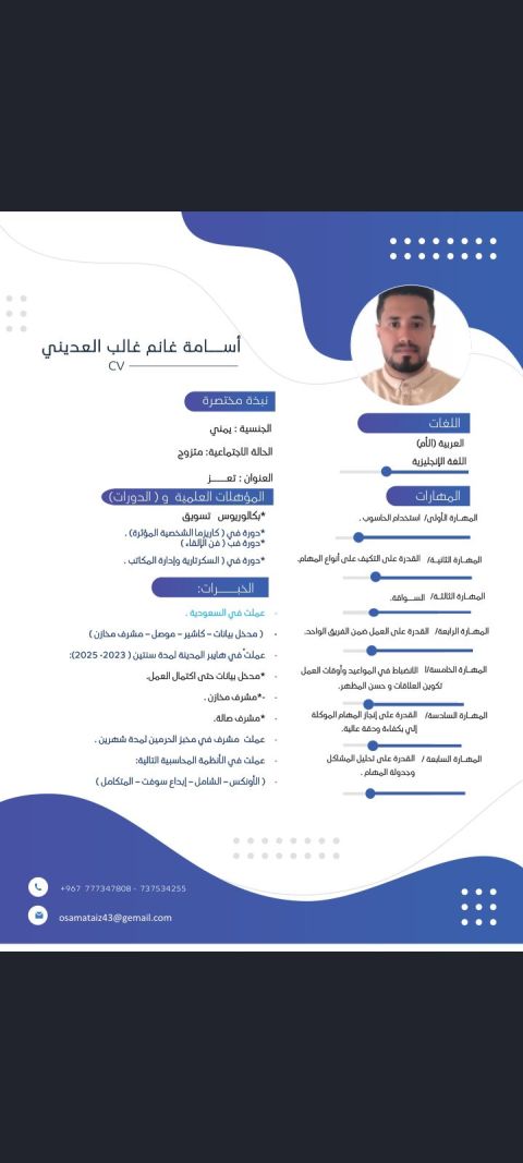 أنا مدخل بيانات عبر الأنظمة المحاسبية خبرة لا تقل عن 5 سنوات اشتغلت ع الشامل ويب وع الأونكس ابروا وع المتكامل وع أسماك وع رواء ومشرف مخازن من ناحية ما تبعه المخزون والأصناف الراكدة وعمل حلول لها ورفع تقارير بالأصناف الأكثر حركة لكي لا تنقطع مخزونها وكما أني عندي لباقة في الكلام وحسن المظهر وعملت مبيعات وسؤل بيع الجملة وشرف صالة هيبرات ومؤسسة زينه سيارات جملة وتجزئة. وعندي شهادات خبرات متعددة