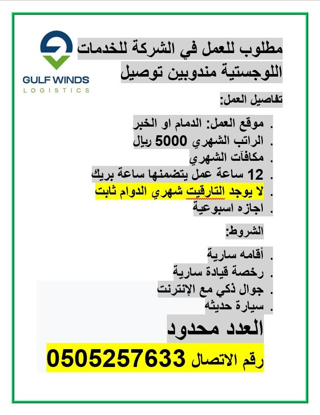 مطلوب سائقين توصيل لشركة رياح الخليج للخدمات اللوجستية في الدمام، حي السوق، تفاصيل العمل نينجا الراتب ثابت الشهري 5000 ريال مكافآت شهرية ساعات العمل 12 ساعة (تشمل ساعة بريك) لا يوجد تارجت شهري (الدوام ثابت) إجازة أسبوعية الشروط إقامة ورخصة قيادة سارية جوال ذكي متصل بالانترنت توفر سيارة العدد محدود للتواصل عبر