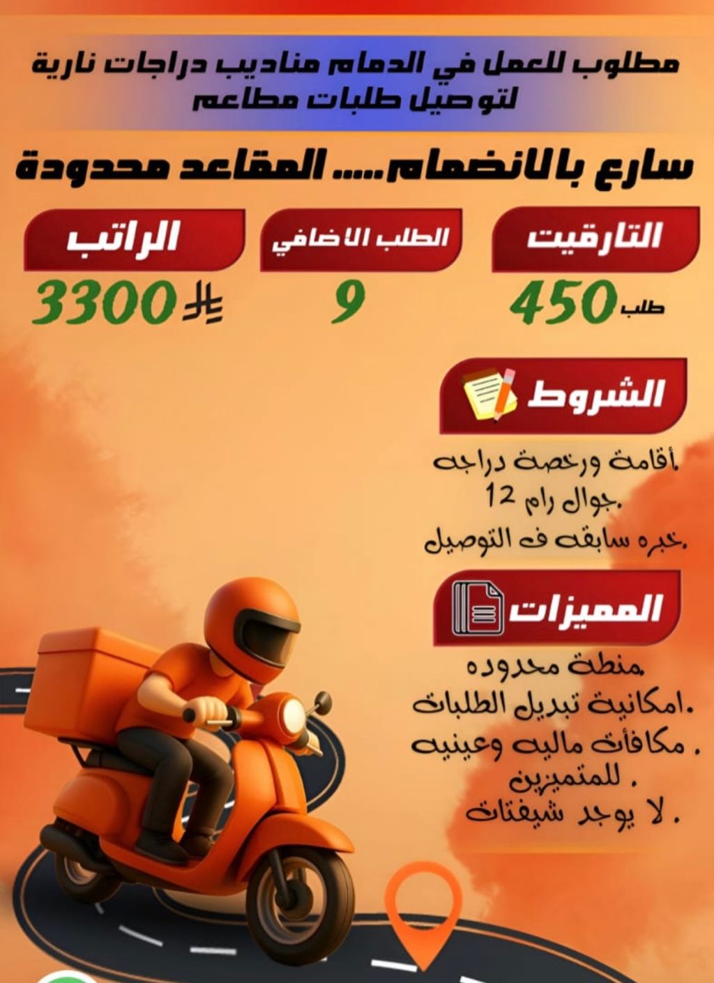 راتب 3300 ريال المقاعد محدوده تعلن شركة لوجستيه مدينة الدمام حي السوق عن فرص عمل مناديب توصيل مطعم دراجات راتب 3300 ريال + مكافآت للمتميزين / التارقت المطلوب 450 طلب/ الطلبات محصوره في منطقة محدوده مع امكانية تدبيل الطلبات أي طلب زيادة 9 ريال الشروط إقامة + ورخصة