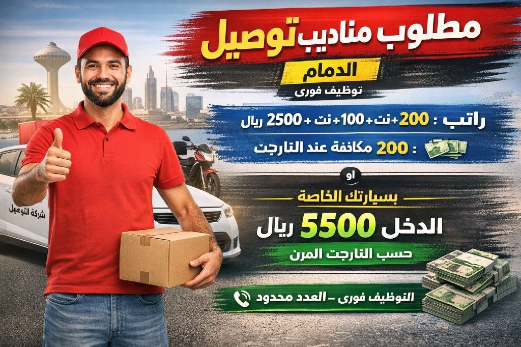 مطلوب مناديب توصيل - الدمام راتب 2500 + 100 نت + 200 مكافأة عند تحقيق التارجت سيارة من الشركة + البنزين على الشركة أو العمل بسيارتك الخاصة الدخل 5500 ريال وأكثر حسب التارجت المرن التوظيف فوري - العدد محدود