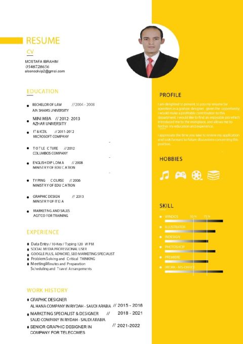 أنا مصمم جرافيك، ومطور مواقع خبرة 8 سنوات بتصميم المطبوعات وادارة، المتاجر الالكترونية وتصميم المواقع والتسويق الالكتروني وتحسين محركات البحث seo وصياغة حملات اعلانية وأجيد العمل علي الفوتوشوب والاليستريتور والكورال درو والأنديزين ومنصات برمجة الورد بريس وسلة وزد ابحث عن عمل والأفضل عن بعد أون لاين