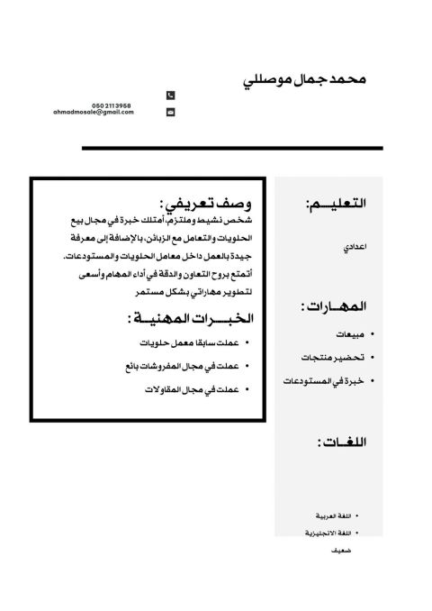 أرغب في العمل في مجال المبيعات الحسابات كاشير حاصل على بكالوريوس نظم معلومات سبق العمل كاشير ثم محاسب في سلسلة مطاعم التحقت بعمل المبيعات وأيضا شغل المقاولات ابحث عن عمل في أي مجال