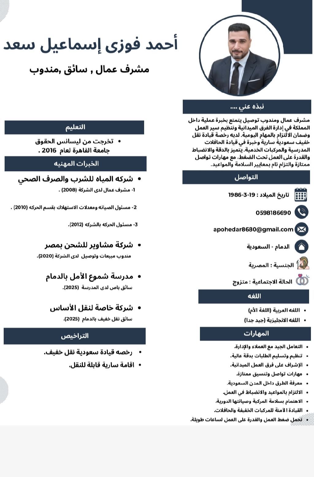 أنا موجود في الدمام حي الباديه ومعي رخصة قيادة نقل خفيف وعملت مشرف عمال وتوصيل طرود