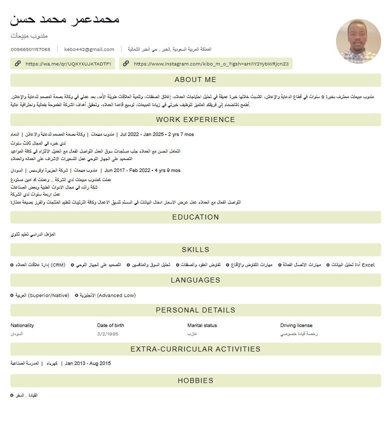 الجنسية سوداني ابحث عن أي عمل لدي خبرات عديدة مثل فن التسويق والقيادة لدي رخصة قيادة خصوصي الإقامة منهية ابحث عن فرد أو مؤسسة لكي يساعدني على نقل خدماتي والعمل معه بجد (عدد النقلات أول نقله)