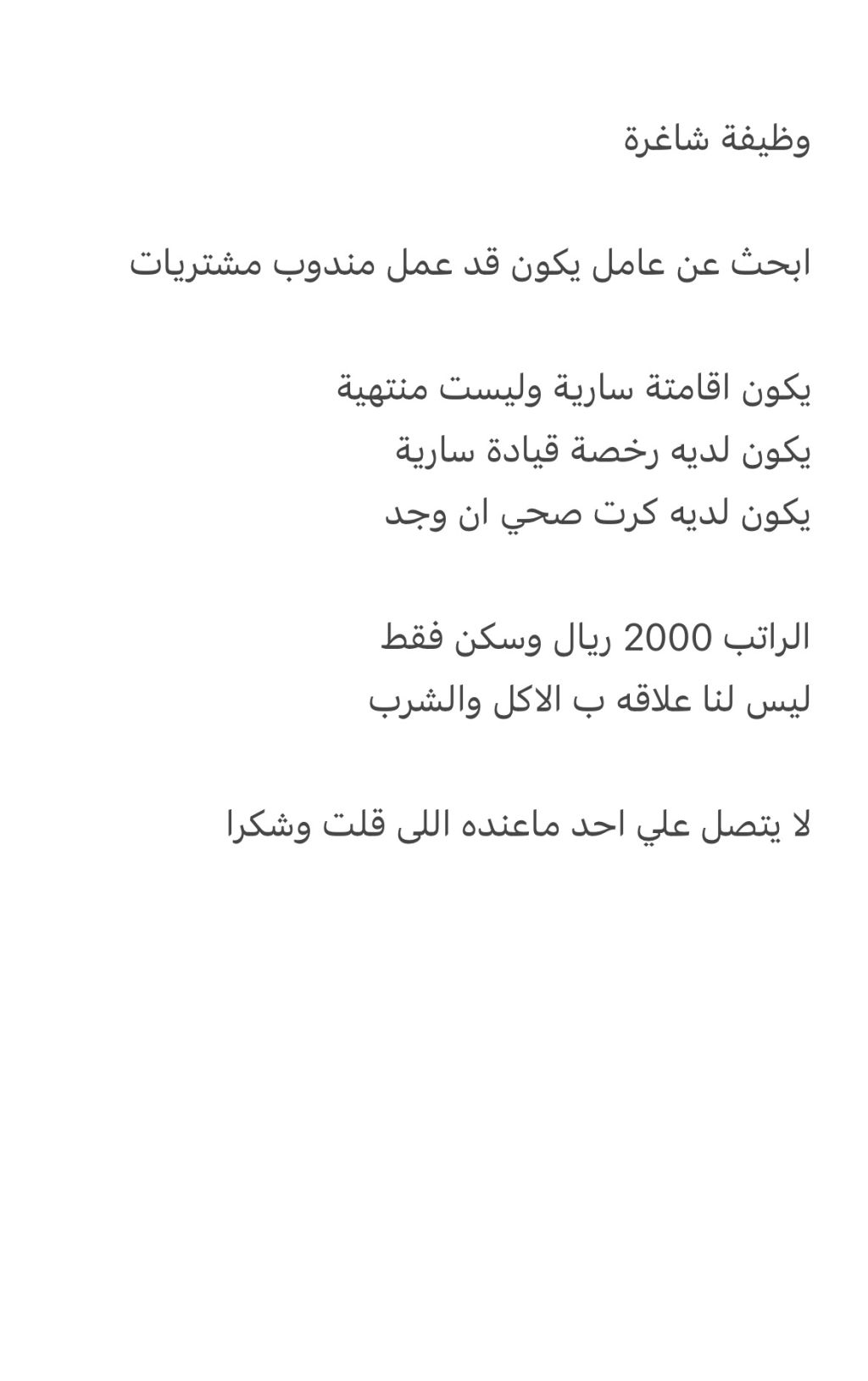 وظيفة شاغرة ابحث عن عامل يكون قد عمل مندوب مشتريات يكون أقامتة سارية وليست منتهية يكون لديه رخصة قيادة سارية يكون لديه كرت صحي أن وجد الراتب 2000 ريال وسكن فقط ليس لنا علاقة ب الأكل والشرب لا يتصل علي أحد ما عنده اللي قلت الدمام حي طيبة