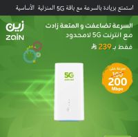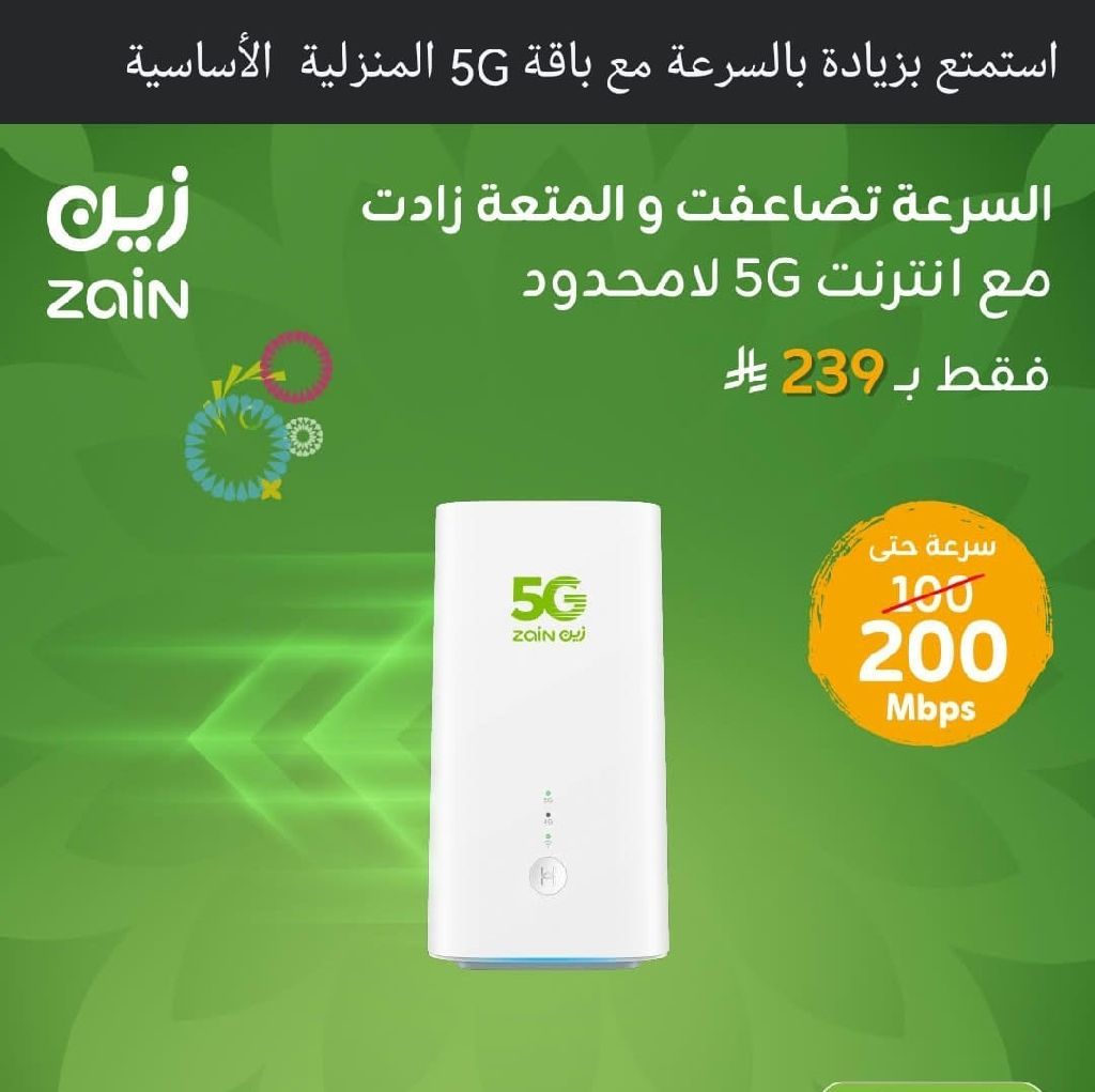 موجود عرض جهاز زين 5G باقة سرعة 200 ميجا بنفس سعر أل 100 ميجا ب 239 ريال لفترة محدوده نت مفتوح يقدر يشيل معاك لحد 20 جهاز بنفس الكفاءة نسعد بخدمتكم للتواصل