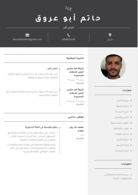 خالد عاطف 26 سنة مصري الجنسية متواجد في الرياض ابحث عن عمل، جاهز للعمل وسريع التعلم ولدي الخبرة في ادخال البيانات ومعالجتها بسرعة ودقة عالية ولدي خبرة في برامج مايكروسوفت أوفيس والفوتوشوب وملم بكل ما يخص الكمبيوتر وأتميز بالسرعة وانجاز المهام عليه، إقامة سارية ومتاح نقل كفالة