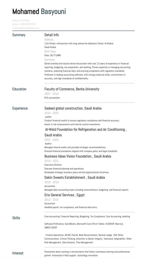 مراجع مالي خبرة أكثر من عشر سنوات في انشاء النظم المحاسبية والدورات المستندية واداراتها والتدقيق عليها وتجهيز واعتماد ورفع التقارير للمساهمه في تطوير جميع العمليات والقرارات الادارية
