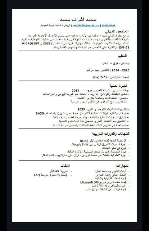 الاسم محمد أشرف الوظيفة المطلوبة موظف اداري الموقع الرياض، السعودية الجنسية مصري المؤهل خريج كلية الحقوق الخبرات خبرة في الأعمال الادارية والتعامل مع العملاء اجادة استخدام الحاسب الآلي وبرامج Microsoft Office حاصل على شهادة ICDL القدرة على العمل تحت ضغط وضمن فريق المهارات تنظيم الملفات والمواعيد كتابة المراسلات الرسمية والتقارير مهارات تواصل ممتازة الالتزام والانضباط في مواعيد