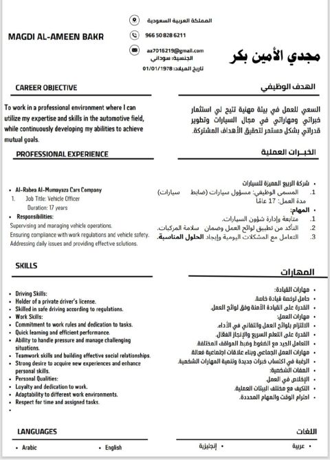 خبرة 17 سنة في شركة الربيع المميزه للسيارات في الجبيل وأحمل رخصة قيادة واقامة قابلة للتحويل