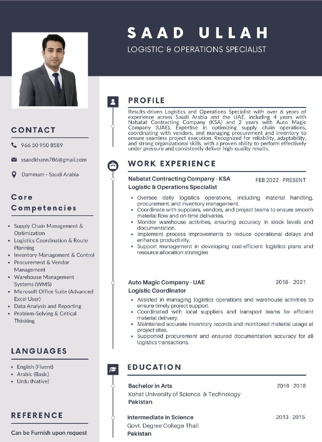 Results - driven Logistics and Operations Specialist with over 6 years of experience across Saudi Arabia and the UAE, including 4 years with Nabatat Contracting Company (KSA) and 2 years with Auto Magic Company (UAE) Expertise in optimizing supply chain operations, coordinating with vendors, and managing procurement and inventory to ensure seamless project execution. Recognized for reliability, ada