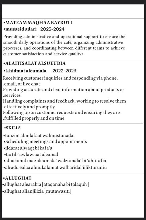 أطلب عمل بوظيفة مساعد اداري حيث أملك الخبرة والمهارات اللازمة التي تؤهلني للقيام بهذه المهام بكفاءة وجدية. لدي خبرة تمتد لأكثر من سنتين في مجال الاشراف على العمال وتنظيم العمل وتوزيع المهام، مع القدرة على متابعة سير العمل وضمان الالتزام بالجودة ومعايير السلامة، بالاضافة الى مهارات القيادة والتواصل الفعال مع فريق العمل والإدارة