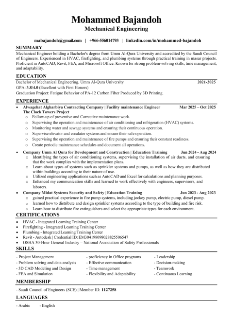 مهندس ميكانيكا خريج جامعة حكومية، حاصل على عضوية الهيئة السعودية للمهندسين خبرة في مجال المقاولات ومكافحة الحريق والتصميم والصيانة والتشغيل والتنفيذ في المشاريع وحصر الكميات وقراءة المخططات وعمل المستخلصات وتسليم المواقع، حاصل على شهادة دولية الأوشا ولدي رخصة قيادة وإقامة سارية (لا مانع لدي بالعمل في أي منطقة في السعودية)