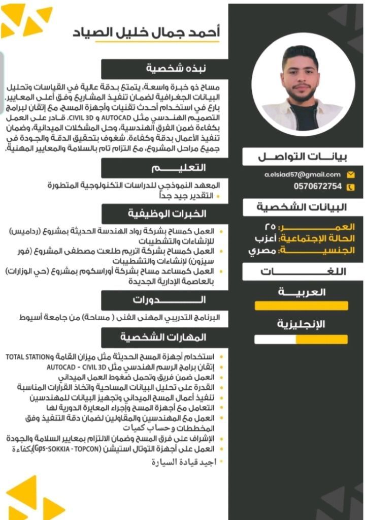 أنا مساح لدي خبرة 5 سنوات في أعمال المساحة، ابحث عن فرصة عمل مناسبة داخل المملكة العربية السعودية. خبرة في أعمال الرفع المساحي توقيع النقاط والمنا سيب العمل على اجهزة Total Station وGPS وميزان القامة اعداد التقارير والرسومات المساحية العمل على AutoCAD وCivil 3 حساب الكميات بدقة العمل في مشاريع انشاءات وتشطيب. مميز تي دقة عالية في العمل الالتزام بالمواعيد القدرة على العمل تحت ضغط سرعة الانجاز