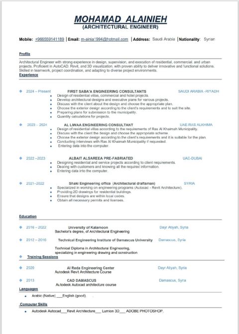 مهندس معماري حاصل على بكالوريوس هندسة معمارية، خبرة أكثر من 3 سنوات في العمل داخل مكاتب استشارية هندسية. متمكن من اعداد المخططات المعمارية، التنسيق مع التخصصات، والالتزام بكوذات البناء والمعايير المعتمدة. شاركت في مشاريع سكنية وتجارية من مرحلة التصميم حتى المخططات التنفيذية. البرامج Revit - AutoCAD. ابحث عن فرصة عمل داخل مكتب استشاري هندسي