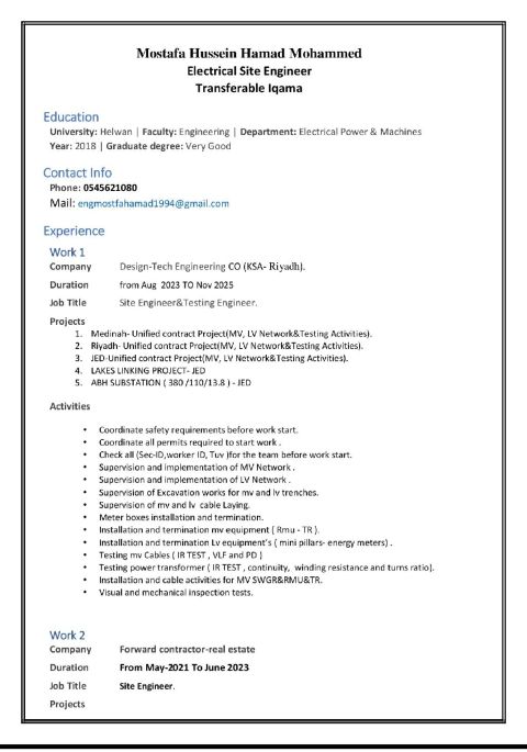 I am writing to express my strong interest in the Electrical Site. Currently based in Riyadh with a transferable Iqama and immediate availability, I bring hands - on experience in the supervision and execution of complex electrical systems for both residential construction and large - scale and Hydropower project
