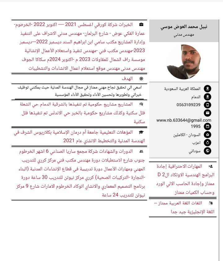 مهندس مدني سوداني خبر ة خمسة سنوات في مجال اشراف المباني والمكاتب الفنية اشراف وتنفيذ علي أرض الواقع ملم بكل بنود التشطيبات وأعمال العظم ومطابقة العمل وفق المخططات الهندسية ورفع المستخلصات أحيد استخدام البرامج الهندسية الاوتوكاد والحاسب الآلي أتحمل ضغط العمل ويوجد لدي رخصة قيادة وإقامة سارية