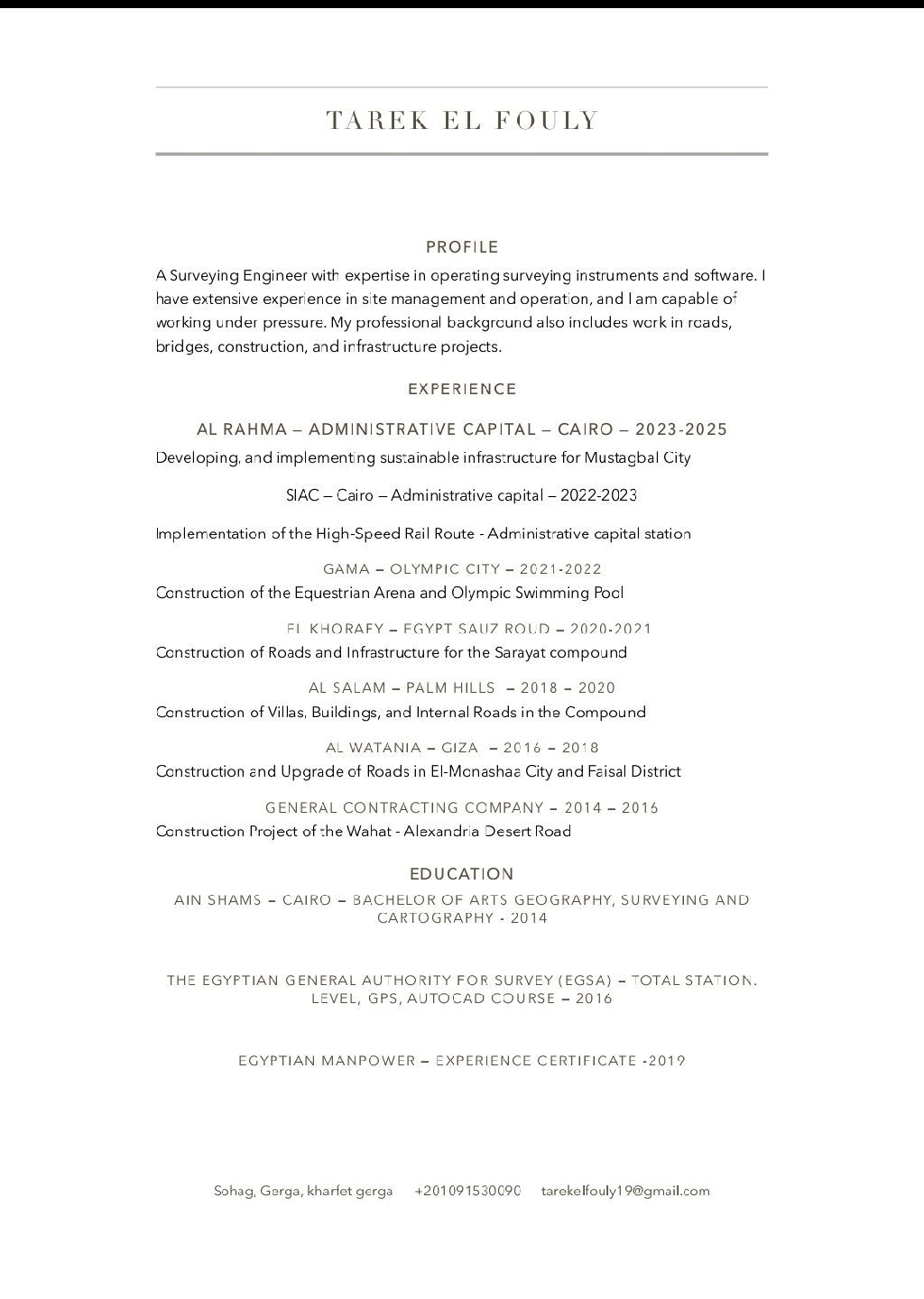 مساح خبرة 10 سنين أجيد العمل على جميع اجهزة المساحة (GPS - Totalstation - level) وأجيد العمل على البرامج المساحية (AutoCAD - Civil 3d) واشتغلت في جميع قطاعات المساحة طرق - بنية تحتية - إنشاءات - كباري
