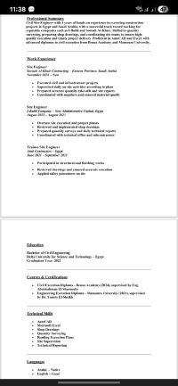 Civil Site Engineer with over 3 years of experience in construction and finishing works across Saudi Arabia. I have supervised and executed more than 40 villas, service complexes, and advertising company projects requiring high precision and top - quality finishing. Proficient in AutoCAD, Excel, quantity surveying, and preparing shop drawings, with strong skills in site supervision and team coordina