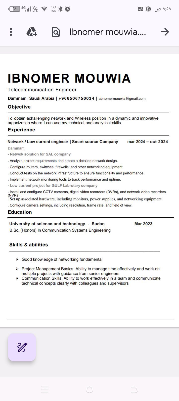 أنا مهندس اتصالات وشبكات حديث التخرج خريج (2023) سوداني الجنسية، ابحث عن فرصة عمل مناسبة في مجال الاتصالات والشبكات. لدي خبرة عملية متميزة في المجالات التالية تصميم وتنفيذ شبكات الحاسب (LAN / WAN) تركيب وبرمجة اجهزة الشبكات (Routers, Switches, Access Points) العمل في تمديد الفايبر أو بتيك تنفيذ أعمال التيار المنخفض (CCTV)