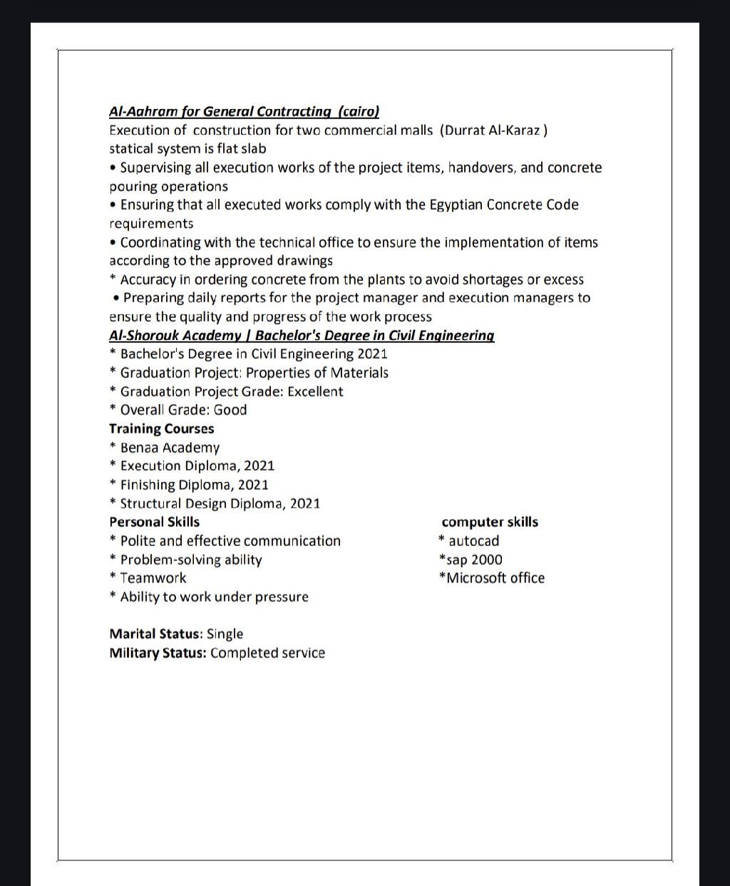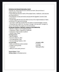 أنا مهندس مدني تنفيذ واشراف موقع خبرة 4 سنوات بأعمال الخرسانات والإنشاءات متواجد حاليا في المملكة تم تنفيذ مشروع فلل ومشروع عمارات سكنيه في الرياض لدي شركة مطور عقاري ومتاح للعمل ومتاح إقامة ورخصة قيادة رقم التواصل