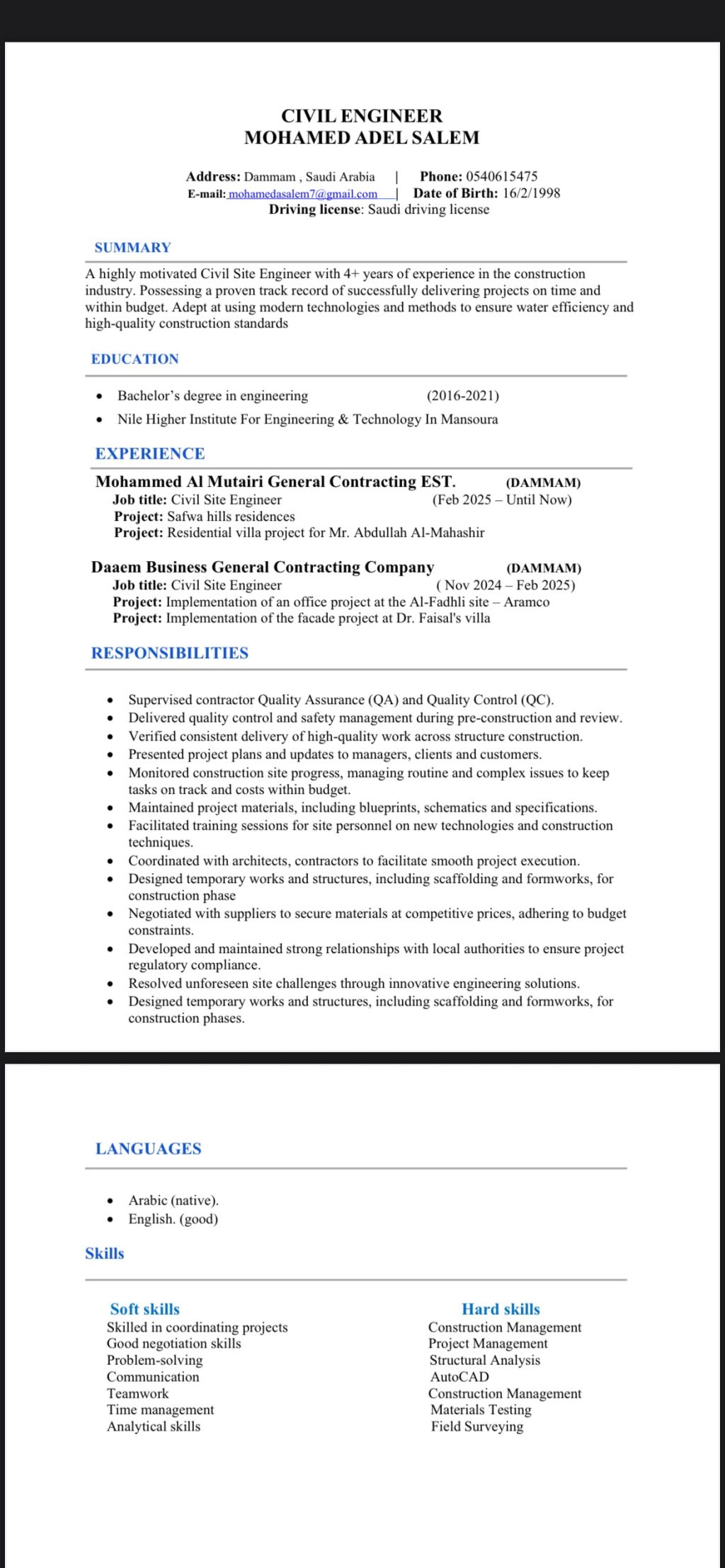 مهندس مدني موقع - متاح للعمل - رخصة قيادة مهندس مدني موقع حاصل على بكالوريوس هندسة مدنية، ابحث عن فرصة عمل مناسبة في شركة مقاولات أو مكتب هندسي. المهارات والخبرات اشراف وتنفيذ أعمال الموقع طبقا للمخططات والمواصفات. متابعة العمال والمقاولين وضبط جودة التنفيذ. حصر كميات واعداد تقارير الموقع. اجادة قراءة الرسومات التنفيذية. التعامل مع AutoCAD وExcel
