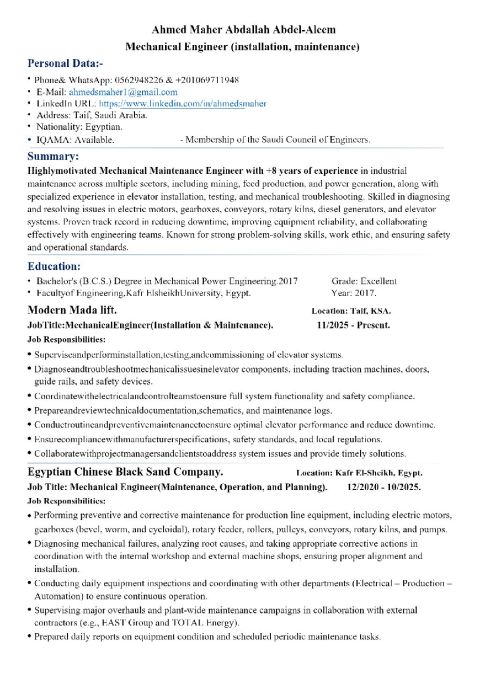 Mechanical Engineer with over 7 years of experience in Industrial and facilities maintenance. Skilled in preventive and corrective maintenance, fault diagnosis, maintenance planning, and technical reporting. Experienced in site supervision, coordinating maintenance teams, and ensuring compliance with safety and quality standards. Strong problem - solving skills with a hands - on field background