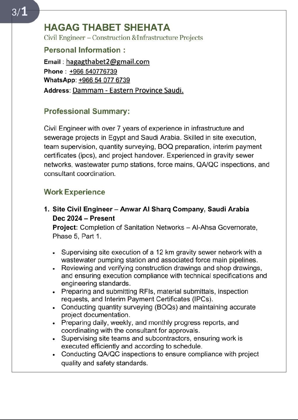 مهندس مدني مصري، خبرة في تنفيذ وإدارة مشاريع البنية التحتية وشبكات المياه والصرف الصحي ومحطات الرفع. لدي خبرة في الاشراف على الأعمال بالموقع، التنسيق مع المقاولين والعمالة، متابعة البرامج الزمنية، واستلام الأعمال طبقا للمواصفات