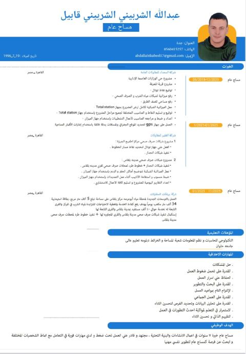 أنا مساح خبرة 8 سنوات ابحث عن عمل متواجد في جدة وعلي استعداد الذهاب الى أي مكان داخل المملكة ونقل الكفالة اشتغلت انشاءات وطرق وبنية تحتية لو في حد قدامه فرصه