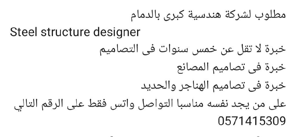مطلوب لشركة هندسية كبرى في العنود في الدمام Steel structure designer خبرة لا تقل عن خمس سنوات في التصاميم خبرة في تصاميم المصانع خبرة في تصاميم الهناجر والحديد على من يجد نفسه مناسبا التواصل واتساب فقط على الرقم التالي