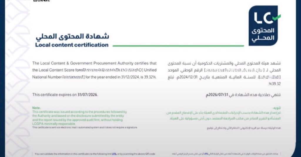 احصل على شهادة المحتوى المحلي الآن بأفضل الأسعار وأسرع وقت انجاز نساعدك في اصدار الشهادة بكل احترافية وسلاسة لتلبية متطلبات الجهات الرسمية وتعزيز فرصك في المنافسات الحكومية. سرعة - أسعار تنافسية - دقة وموثوقية تواصل معنا اليوم وابدأ بخطوتك نحو التميز المحلي