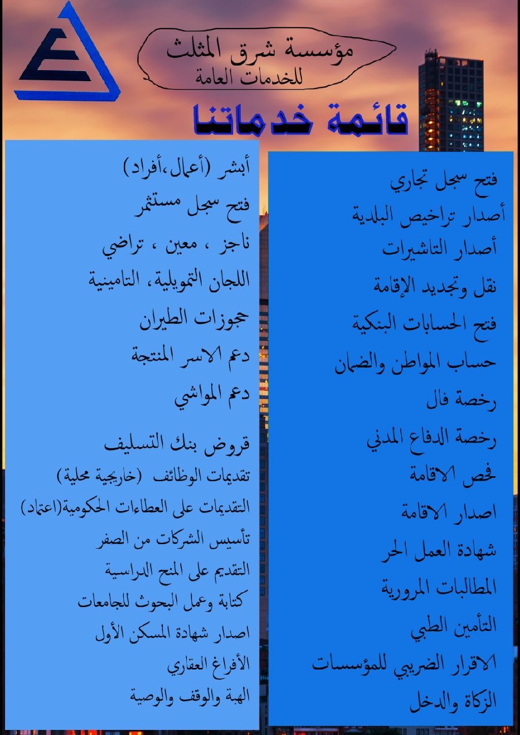 أبرز خدماتنا تأسيس الأعمال والاستثمار اصدار وتجديد السجلات التجارية، فتح الشركات، انشاء الحسابات البنكية (شخصية وتجارية) وخدمات وزارة التجارة وبلدي خدمات الأفراد والعمالة تجديد الاقامات، الهوية الوطنية وجواز السفر، بالاضافة الى حجز المواعيد (أحوال، مرور، مستشفيات) الدعم والبرامج الحكومية التسجيل في حساب المواطن، الضمان الاجتماعي، منصة سبل، وتحديث ملفات مربي المواشي. التأمين والخدمات