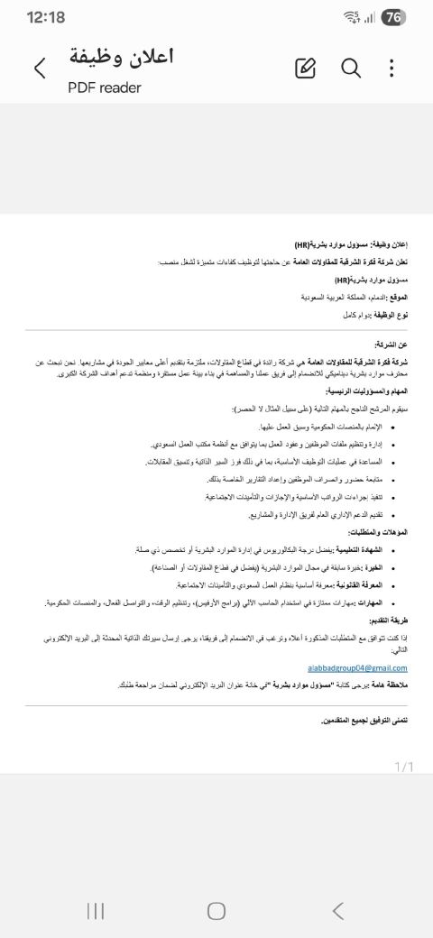 مطلوب لدي شركة مقاولات بالخبر حي الحزام الأخضر موظف موارد بشرية علي دراية بجميع المنصات الحكوميه