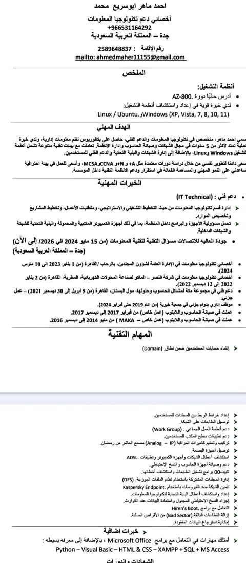 مهندس دعم فني شبكات ذو خبرة في تركيب وتشغيل وصيانة شبكات LAN / WAN، وإدارة اجهزة الاسوتشات والروترات (Cisco, HP, Hikvision) تنزيل برامج وتنزيل أوفيس تفعيل لا نهائي حل المشكلات ودعم المستخدمين ومتابعة الأعطال الفنية ضمن بيئة عمل متعددة الأنظمة. حريص على الالتزام بمعايير الجودة وأمن الشبكات لضمان استمرارية الخدمة بأعلى كفاءة