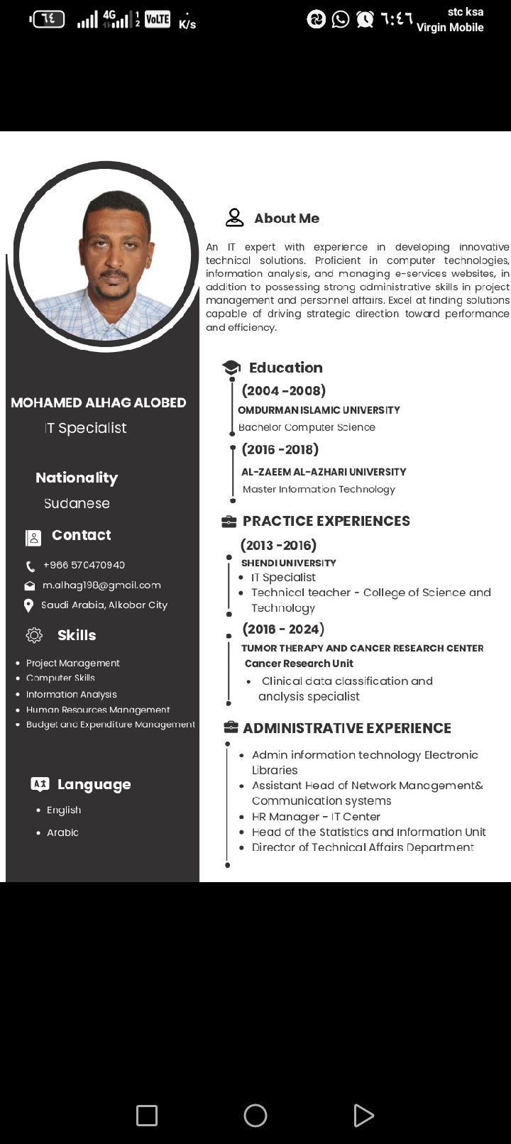 اختصاصي تكنولوجيا المعلومات حاصل على درجة الماجستير في تقانة المعلومات خبرة أكثر من 6 سنوات في مجال تقانة المعلومات وخبرة في مجال العمل الاداري التفاصيل (صورة البروفايل) أرغب في الحصول على وظيفة في احدى الشركات أو المؤسسات