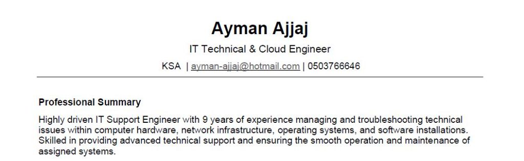 مهندس تقنية معلومات / دعم فني وشبكات يبحث عن وظيفة مهندس تقنية معلومات ودعم فني بخبرة 9 سنوات في مجال تقنية المعلومات، ابحث عن فرصة عمل مناسبة داخل المملكة العربية السعودية. المؤهلات والخبرات خبرة قوية في الدعم الفني وحل مشاكل الاجهزة والشبكات إدارة Microsoft Office 365 العمل على Microsoft Intune وMicrosoft Entra (Azure AD) إدارة ومراقبة البنية التحتية السحابية (Microsoft Azure) وتركيب CCTV