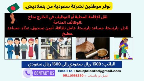 نبحث عن عمل لدينا موظفون مدربون بالاضافة الى مرشحون جدد متوفرون. نقل كفالة متاحا لوظائف المتاحة نادل، باريستا، مساعد باريستا، عامل نظافة، أمين صندوق، مساعد مطبخ. للتواصل