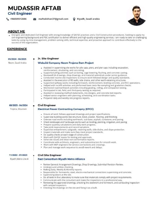 مهندس مدني يهتم بالتفاصيل وموجه نحو النتائج، بخبرة مثبتة تزيد عن 6 سنوات في المشاريع العملاقة، بما في ذلك سد نيوم تر وجينا ومترو الرياض الخط 4. خبرة قوية في الأعمال الانشائية، الطرق، البنية التحتية، وأعمال التشطيبات، مع خلفية راسخة في ضمان ومراقبة الجودة (QA / QC) عمليات التفتيش، ضبط الموقع، والاشراف على الأعمال الانشائية المدنية. ماهر في التنسيق مع الاستشاريين، المقاولين من الباطن، والفرق متعد
