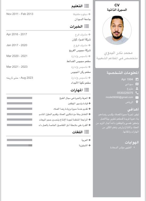 مدير تشغيل مطاعم خبرة أكثر من 22 عام في مجال المطاعم الكبرى والتقليدية. وهندسة المنيو وعمل تقارير المبيعات والمصروفات وضبط التكاليف ووضع جدوال التشغيل ولائحة تنظيم العمل وتأسيس المخازن وضبط الصادر والوارد منها. والالمام بشروط مراقبة الجودة من أيزو وهاساب. والتسويق. إقامة سارية المهنة عامل مطبخ