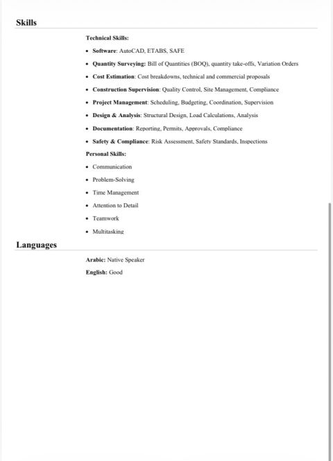 مهندس موقع يمتلك مهارات قوية في فحص أعمال الخرسانة، والتسليح، والقوالب، وقراءة المخططات الهندسية، مع الالتزام بالمواصفات الفنية ومعايير الجودة والسلامة. يتميز بالقدرة على العمل بكفاءة في بيئات العمل السريعة مع دقة عالية ومهارات تنسيق ممتازة. يمتلك خبرة عملية في الأعمال الانشائية، وضبط الجودة، والاشراف الميداني. شارك في إدارة تصاريح العمل ضمن مسؤوليات الموقع، بما يشمل مراجعة التصاريح (permit reciver)