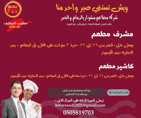 مشرف مطعم مؤهل عالي - العمر من 26 الى 32 - خبرة 3 سنوات علي الأقل في المطاعم - يجيد الانجليزية - يجيد الكومبيوتر كاشير مطعم مؤهل عالي - العمر من 26 الى 32 - خبرة سنة علي الأقل في المطاعم العمل في حي الخبر