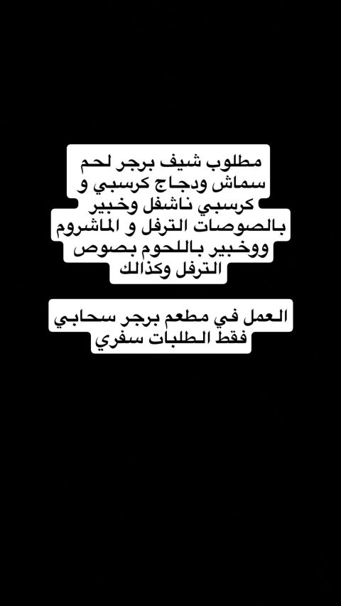 مطلوب شيف برجر لحم سماش ودجاج كرسبي وكرسبي ناشفل وخبير بالصوصات التر فل والماشروم ووخبير باللحوم بصوص التر فل وكذلك العمل في مطعم برجر سحابي فقط الطلبات سفري المنطقة الشرقية الخفجي حي الجوهرة