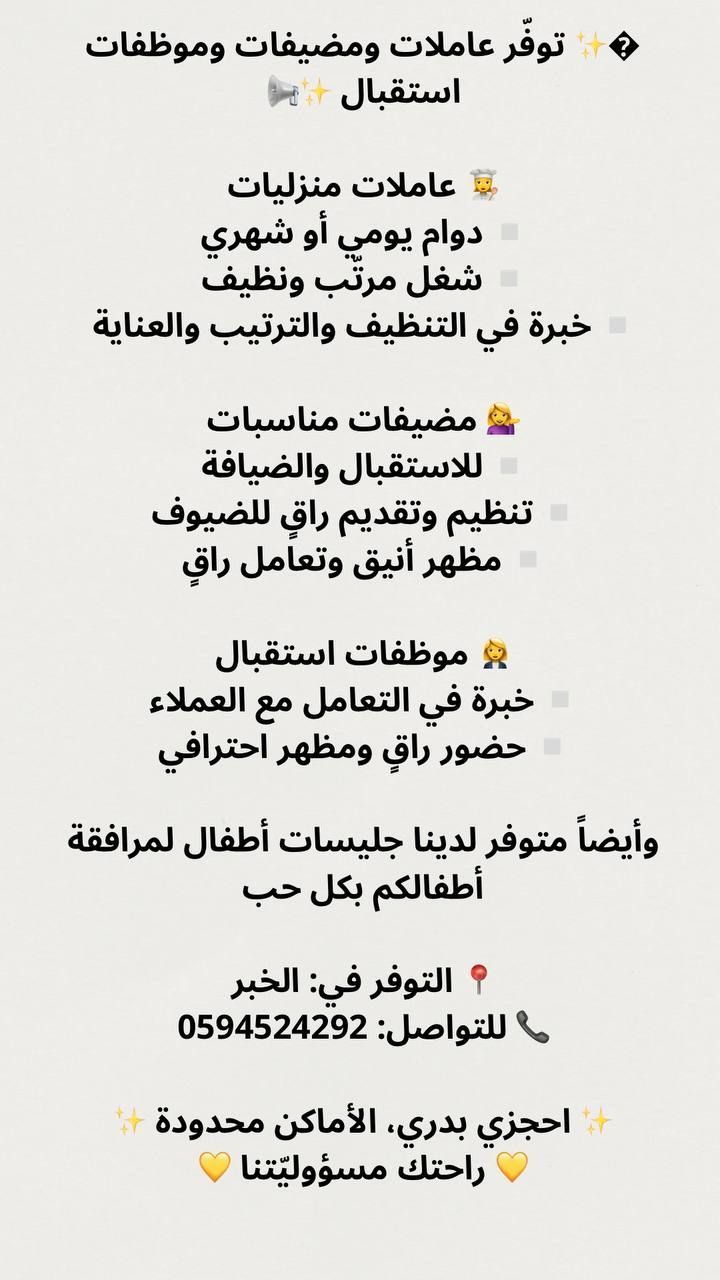 توفر عاملات ومضيفات وموظفات استقبال ومصورات جوال عاملات منزليات دوام يومي أو شهري شغل مرتب ونظيف مضيفات مناسبات للاستقبال والضيافة تنظيم وتقديم راق للضيوف مظهر أنيق وتعامل راق موظفات استقبال خبرة في التعامل مع العملاء حضور راق ومظهر احترافي جليسات اطفال لرعاية ومرافقة اطفالكم بكل حب واهتمام مصورات جوال لتغطية مناسباتكم بأجمل اللحظات متوفرين فالخبر